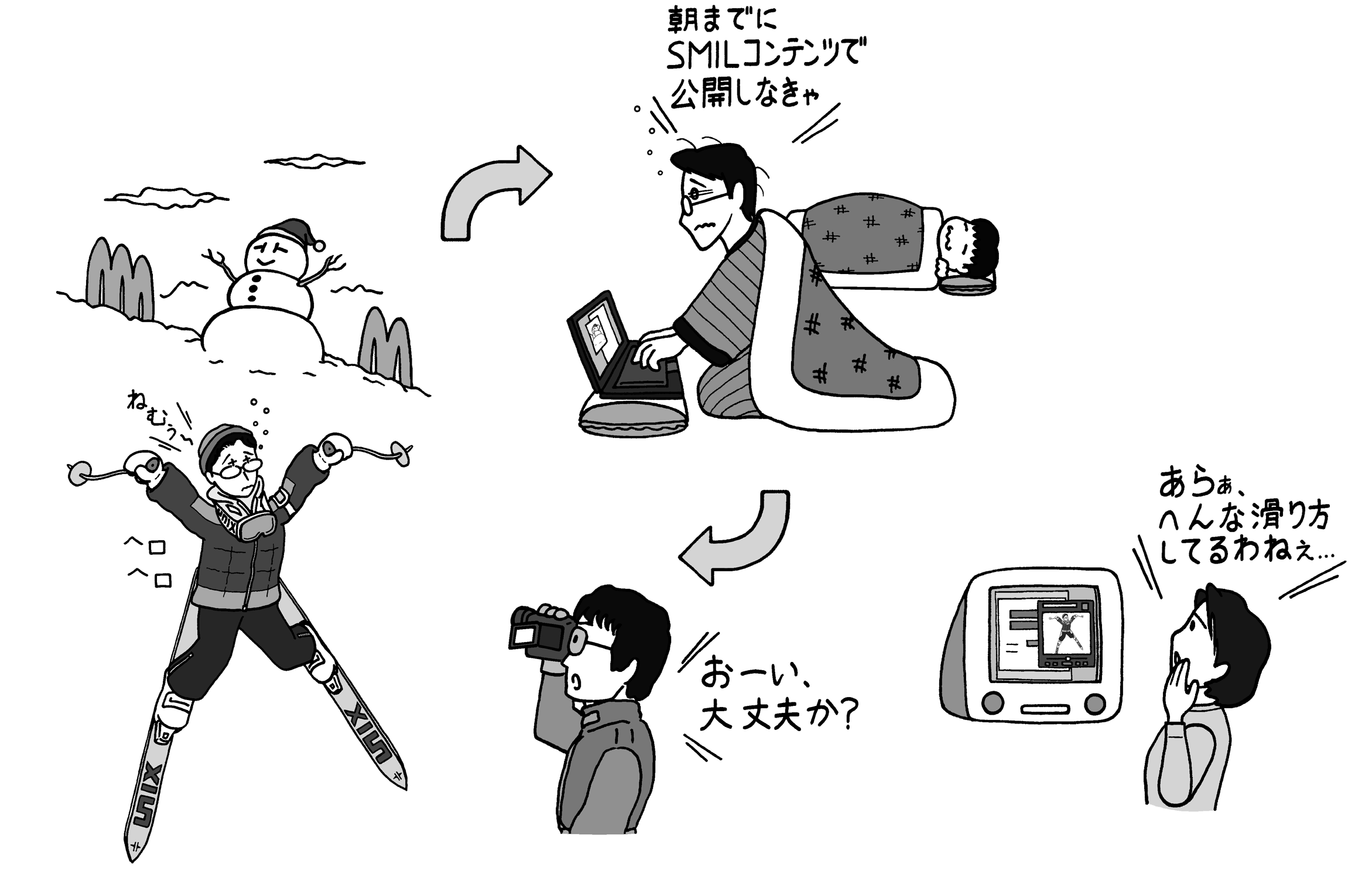SMILは、W3C注16Synchronized Multimedia(SYMM) Activityの一環として開発された、XML 1.0をベースにした記述言語であり、動画、音声、テキストなど、異なるメディアのオブジェクトを同期させるもの。SMILを使用することで、Web上でスライド、音声、ビデオ映像、文書を同期させた、マルチメディア・プレゼンテーションを実現することができる。